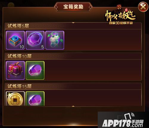 《师父有妖气》的试练塔中包含了来自三界的精英妖怪,玩家需要从塔底到塔顶逐级挑战。随着层数的增高,妖怪的实力以及获胜后的奖励也会逐渐提升。每完成5层会有一个BOSS镇守,挑战成功后即可获得一次大奖。
