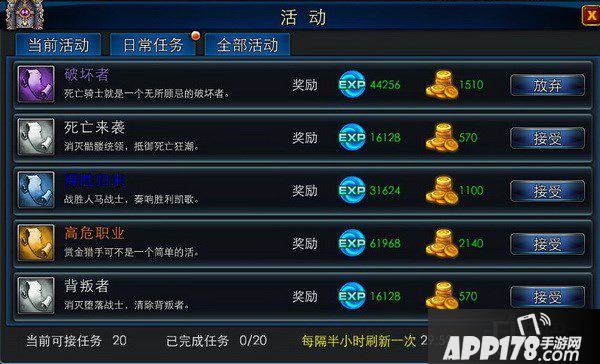 30级之后日常任务就会开放啦。点击主页面活动按钮可以进入,每天只能完成20个任务,第二天会重置,所以千万不要错过。