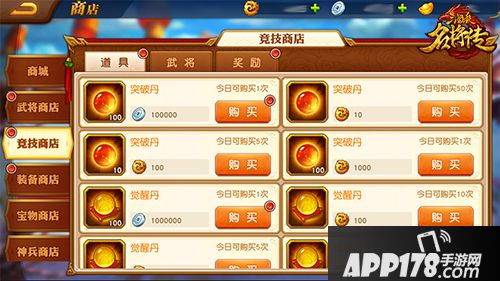 突破丹在武将商店、竞技场商店、军团商店均有售,使用将魂、威望和军团贡献即可兑换。