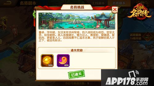 2、每天有5次名将副本挑战次数,每天可以继续挑战新的名将关卡或者扫荡已通过的关卡,但每个关卡每天只能挑战一次。