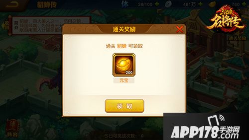 4、每通关一个名将传记,还可以领取通关宝箱,内含丰厚的元宝奖励哦。