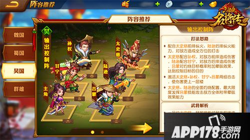 优点:阵容比较全面,太史慈和陆逊保证了前后排全方位纵火,孙权、甘宁在灼烧加成下可以发挥最大化输出,吕蒙提供全体控制。