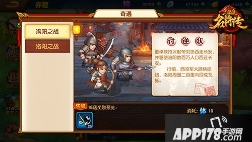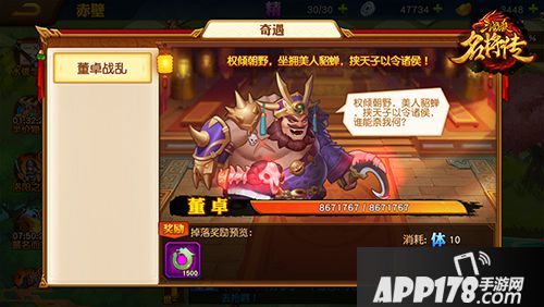 董卓之乱:战斗类事件,消耗体力战斗,可获得经验值和宝物之魂(可在宝物商店购买奖励)。