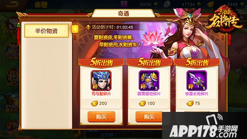 半价物资:限时折扣商店,有几率刷出红将碎片、橙色宝物碎片等珍贵道具,购买价格均为半价。