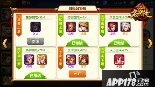 名将册是通过收集特定武将的关联武将来激活,增加该特定武将攻击、生命、防御属性的小型图鉴。