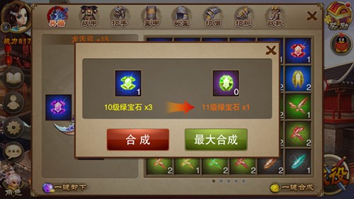 一级宝石所提升的战力并不多,所以宝石需要不断地合成来提升等级。在游戏中,三颗相同颜色的宝石就可以合成更高一级的宝石。同时还可以随时卸下宝石,替换其他颜色的宝石镶嵌到宝石槽中,且无需消耗任何资源。不过在缺乏宝石的情况下,并不建议玩家一味的合成宝石等级,而让部分的装备出现没有宝石可以镶嵌的情况。需要注意的是,同一个兵器上不能镶嵌两颗同样类型的宝石。