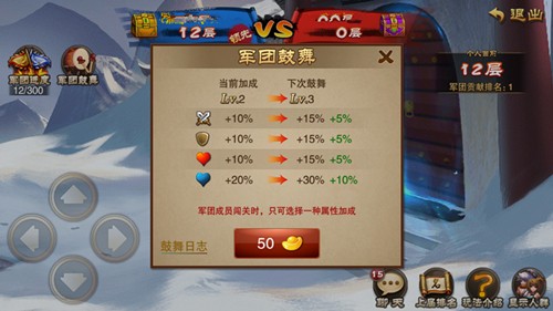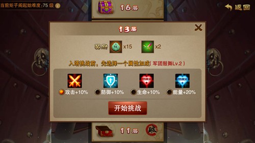 在挑战过程中,军团成员可以通过军团鼓舞来加强所有参赛人员的属性,并在进入关卡前,选择一项属性加成进行挑战。每一层的挑战都会获得矩子令的奖励,在通关特定层数的关卡后还会获得额外的宝石奖励。如果玩家达到足够的战力,就可以扫荡一定层数的关卡,并可从中获得奖励。