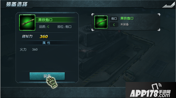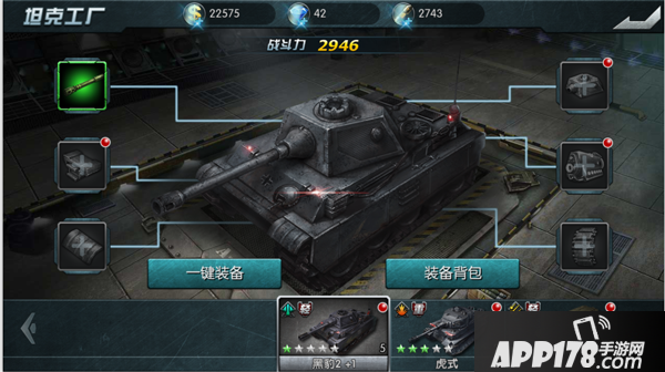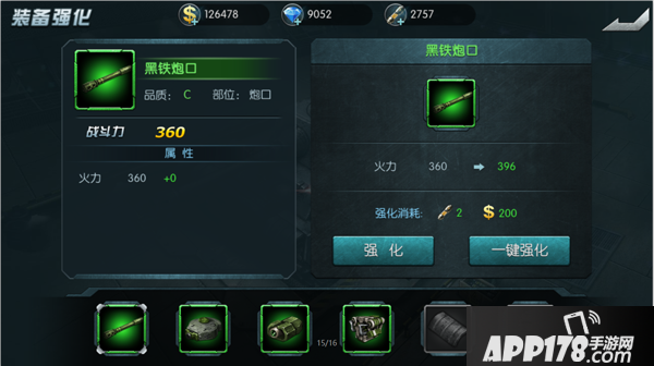 可以发现获得不少坦克的部件,有的是发动机,有的是炮管,有的是履带等等。没错,这些都是坦克的装备部件,点击装备上。有品质的区别,越高品质的装备属性越高。可以使用游戏内的金币和强化点对其强化,可以一键强化(前期要视自己的金币数量,没错,省着用始终是正确的,因为前期的资源比较稀少)提升更高的战力。