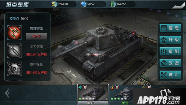 当然,坦克也有专属核心技能和普通技能。每进阶一个等级(D-C-B-A),解锁一个技能。技能点为每5分钟恢复一点。别忘记点它,这是增加战力的有效方法。