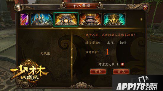 除了以上两种方式外,玩家还可前往 《功夫少林》活动副本“十八重楼”来获取日常必备材料铜钱和真气。“十八重楼”由少林久负盛名的“十八铜人阵”组成,虽然通关难度较大,但相应通关奖励也会大大提升。每通关一层就会获得不少铜钱奖励,如果能够登顶十八重楼,不仅在实力上会得到所有玩家的认可,还会得到一笔非常可观的财宝。现在还等什么,马上闯关吧!