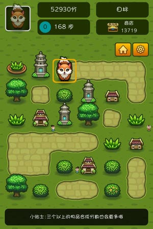 三个相同物品合成高一等级的物品,合理利用走位再继续合成更高等级的物品,直至建成各种宏伟的建筑,达到我们的各种目标。建设过程中,还会有超萌的捣蛋小狐狸出现,不过,你需要适时的搞定它们,避免影响你的建设,游戏中随机出现的各种道具也很关键哦,巧妙的利用道具让你的建设事半功倍。