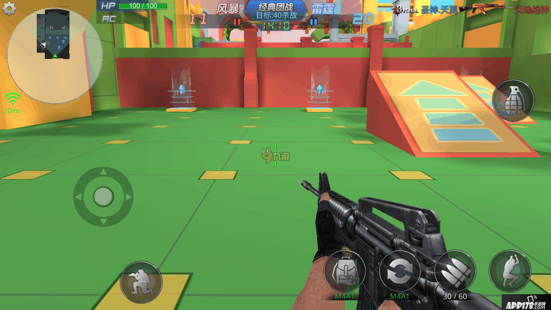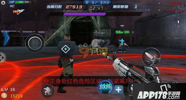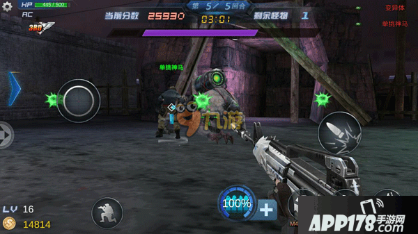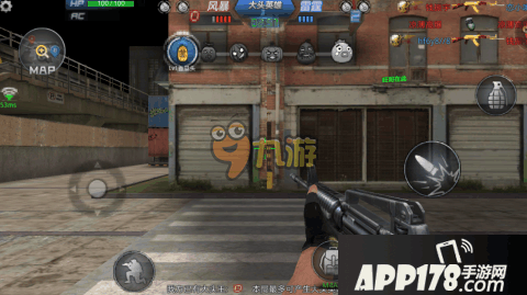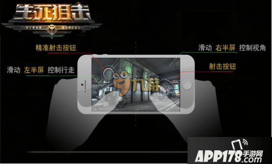 游戏采用FPS常见的操作方式,采用虚拟的键盘设置,左下角为移动键,右下角为射击键,还有一些其他的功能按键。