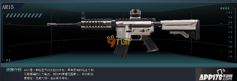 除了威力和穿透略逊色于AK47之外,AR-15它的稳定性、射速、以及精准和便携都大大优于AK47。可以说两把枪各有千秋,俗话说的好萝卜青菜各有所爱,有人一开始只追求威力巨大的AK47,但是更多的新手玩家都会去选择相对稳定精准的AR15,所以把它设定为新手入门枪支是再合适不过了。