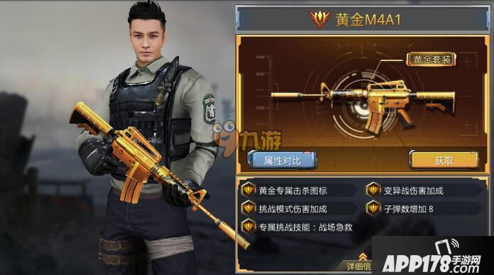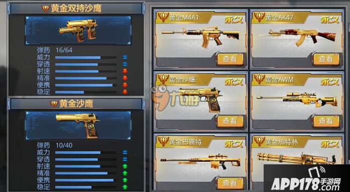 介绍:独特黄金构件制造,外观华丽,凸显王者,小编觉得这款枪械绝对是霸道总裁的最爱,就是拿出来装B也会觉得高端、大气、上档次。