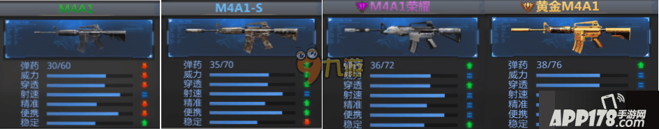 手游测试,商店发布了M4A1枪型一共有四把,分别是M4A1、M4A1-S、M4A1荣耀、黄金M4A1,我将这四把枪分别进行对比,性能由弱到强做了如图的排列。