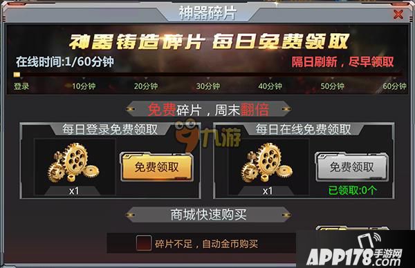 想要免费获得神器碎片只要每天玩游戏就可以啦!周一至周四每天可以获得7个碎片,周末每天可以获得14个碎片,每周共可免费获得70个碎片!