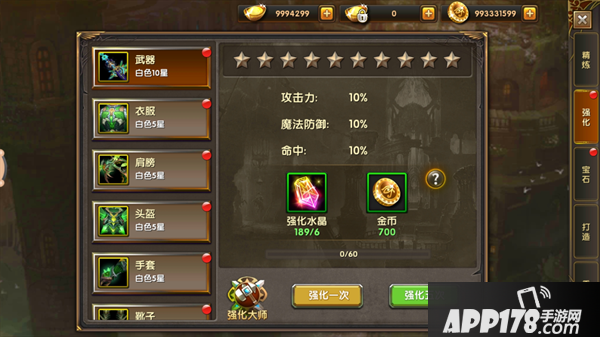 玩家可以通过消耗强化水晶,多次强化某个装备部位。装备强化可以百分比提升装备的基础属性,更换装备时强化等级保留。