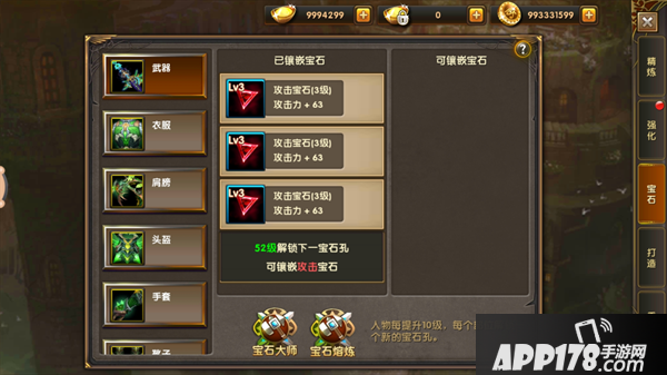 玩家可以通过宝石镶嵌,将各类宝石镶嵌到装备上,让装备获得该宝石的属性。