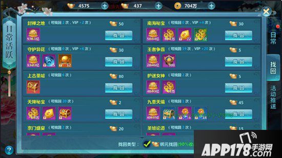 不过错过活动还能够获得奖励,那不是对那些参加活动的玩家不利。其实找回资源只能够获得活动的常规奖励,也就是说在活动副本中额外的奖励是获得不到。而且找回资源最多只能够获得原来收益的90%,还必须使用绑定元宝才可以,如果用铜钱找回,那么顶多只有50%。