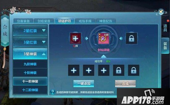 ※合成:角色达到要求的等级可在神装合成界面通过注入3件红色三星装备和特定数目的神磁石即可合成神装(凑齐所有材料合成的成功概率为100%)。