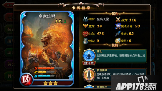 皇家雄师属于至高天堂,拥有多重撕咬、高级易伤、狂怒三个技能;其中多重撕咬可连续攻击多次,每次对目标造成全力攻击力的伤害;高级易伤技能可多次叠加增加敌方受到的物理伤害致使目标获得易伤;狂怒是他提升攻击力,并附加吸血效果;所以说,在混战状态之中,皇家雄师借其突出的攻击技能具有很大优势。