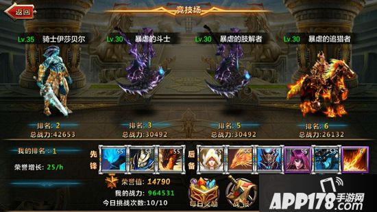 在每一场战斗开始之前,玩家可以点击想要挑战的角色,查看他的战力与先锋英雄的阵容。聪明的玩家会根据自己挑战对手的情况来决定自己最终的登场阵容。一般来说,玩家们的后备英雄的强度没有先锋的强度高,所以在《神魔之战》的竞技场中,玩家可以先用自己的先锋英雄与对手硬碰硬,先锋英雄获胜的一方基本就能够锁定胜局了。