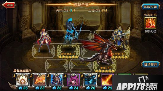《神魔之战》目前的竞技场采用的是镜像战斗的方式,在作战过程中,玩家无法像推图中那样对自己的阵容进行即时的操作。此时,布阵与料敌先机就变得极为重要。在阵容调整界面中,玩家在调整自己阵容的先锋与后备英雄之外,还能够决定后备英雄、英雄技能的顺序和主角的出击时机。在挑战一次后,系统将随机选取4为玩家作为下一轮的对手。