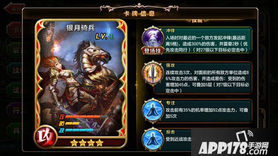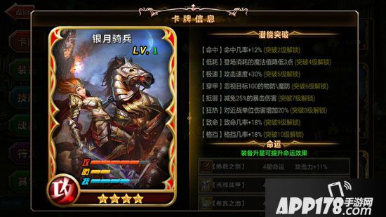 银月骑兵的潜能突破也是进一步加强了输出能力,降低了上场的费用。总的来说,银月骑兵就是作为后备英雄登场而生的。银月骑兵提升到5星之后,攻击力不亚于大多数已经升到6星的卡牌哦!