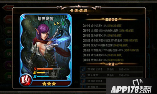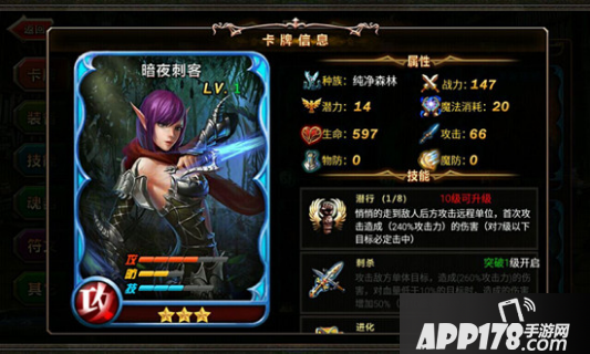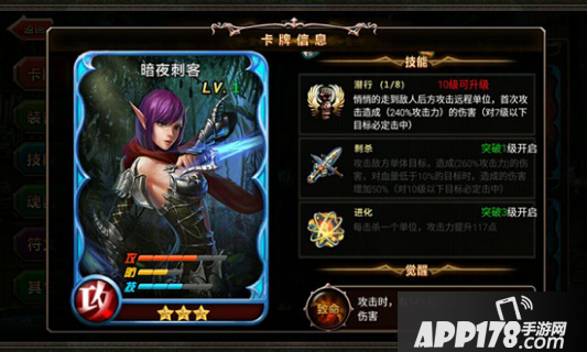 技能方面,潜行可让她悄悄的走到敌人后方攻击远程单位,首次攻击造成两倍多攻击力的伤害,并且对级别底的目标必定击中;刺杀攻击敌方单体目标,造成攻击力近三倍的伤害,对血量较低的目标时,增加一半造成的伤害,且对级别低的目标必定击中;进化在击杀每一个单体,攻击力提升一些点数。