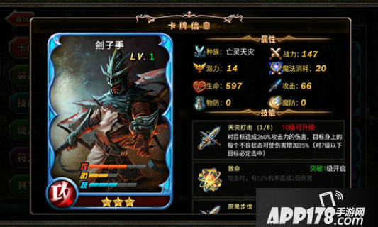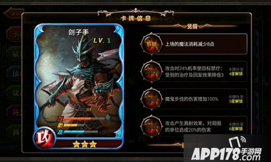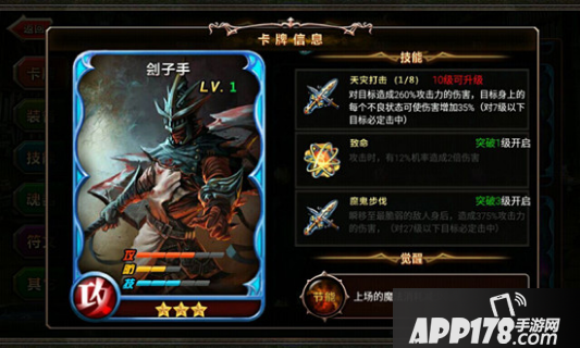 觉醒技能方面,节能可减少上场时的魔法消耗,攻击时有可能使目标禁疗,受到的治疗和回复效果降低;增疗全力的魔鬼步伐伤害增加,攻击产生溅射效果,对周围单位造成较多伤害;所以他是以攻击伤害为主,技能还不错,但防御能力偏弱,所以在使用他的时候可搭配防御能力比较强的卡牌英雄。