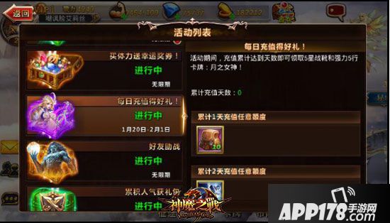 《神魔之战》还为大家提供了每日充值送好礼的限时活动哦!在活动期间,玩家只要累计充值达到指定天数,就可以获得超强战备和强力卡牌!累计天数越多,礼物就更给力!更有你们梦寐以求的超强辅助月之女神作为终极好礼,没错,只要每天充值,就能轻松带女神回家!