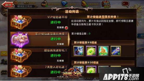 作为《神魔之战》的长期活动,也是运营团队为广大玩家们提供的无限期福利。只要在活动期间内,累计充值达到指定金额,就可以获得五星级豪华装备和独有的五星级卡牌炽天使!觉得阵容缺乏一个超强保护型英雄?那么就来参加这个活动吧!
