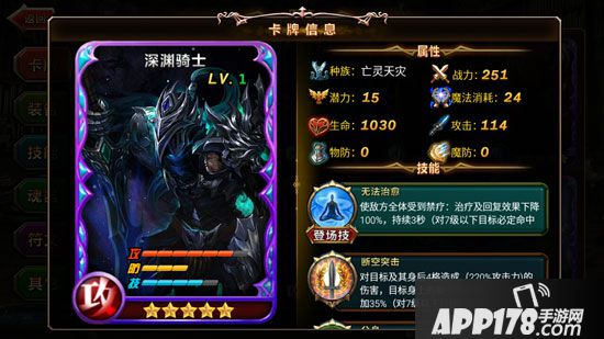 深渊骑士是《神魔之战》亡灵天灾一方的主要攻击手。相比前两位骑士来说,深渊骑士的技能效果则偏重与对敌方英雄续航能力的削弱。深渊骑士的禁疗效果能够让敌人的辅助英雄的治疗效率降低,使得我方更容易突破敌人的先锋坦克。深渊骑士则需要从王者之路商店中获得。