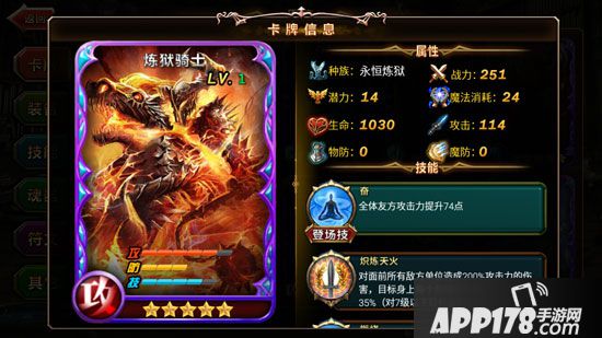 《神魔之战》中的炼狱骑士与他在天堂的兄弟烈日骁骑相比,防御力略低一些,但技能效果更有优势。炼狱骑士能够为己方单位提升攻击力,让敌人获得燃烧效果,并且能够将目标所受到的伤害在敌人上场的英雄中传导。如果说烈日骁骑是单点突破,那么炼狱骑士就是全面开花。获取炼狱骑士玩家需要挑战叹息之塔中的炼狱骑士boss哦!