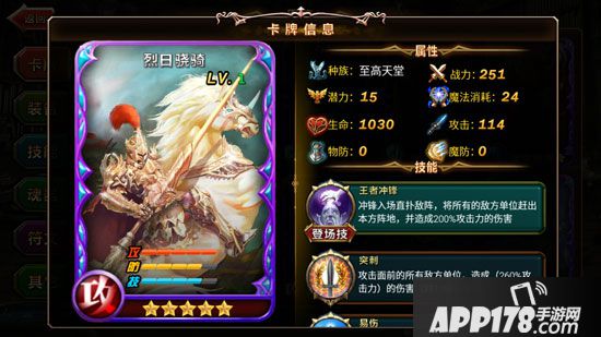 烈日骁骑是《神魔之战》至高天堂的中流砥柱,是一个名符其实的输出型战士。登场技冲锋能够将所有敌人赶出我方阵地,帮助我方重新布阵重整旗鼓。烈日骁骑其他的技能则能够忽略目标的护甲,给攻击附加易伤效果。总之,只要让烈日骁骑找到机会就能够对敌人造成成吨的伤害。想要获得他,玩家需要通过精英关卡和神秘宝库收集卡牌碎片。