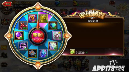 玩家可以从主界面左侧上方的幸运转盘按钮进入幸运转盘活动。每次幸运转盘抽奖,玩家能够从7样消耗品、1个英雄的卡牌碎片、1件4星装备、1个四星技能中随机获得一样。