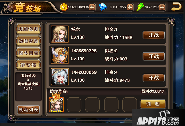每天每位玩家可以在不同的竞技场分别发起五次挑战哦,奖励多多(偷偷告诉你们,每当排名上升会有大量钻石奖励哦)千万别错过!