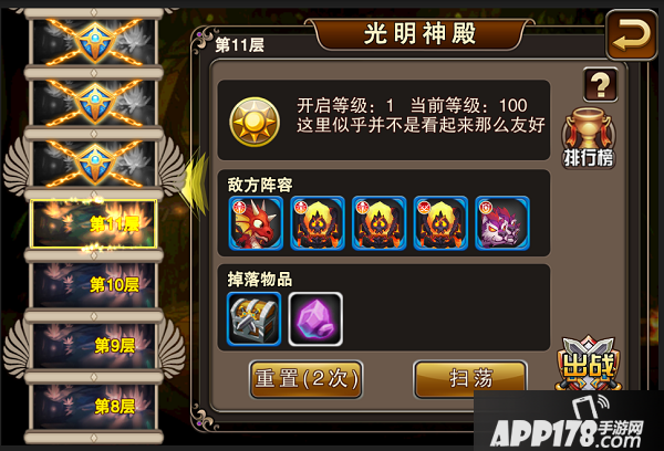 每次通关后都可以获得相应的道具和货币奖励哦,BOSS层还会有一个神秘宝箱哦,还不快从哈迪斯军手里夺回光明神殿!