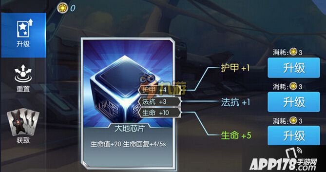 每张芯片都会有3条属性,分别由护甲、法抗、生命、攻击、冷却等组合而成。属性可以进行升级与重置: