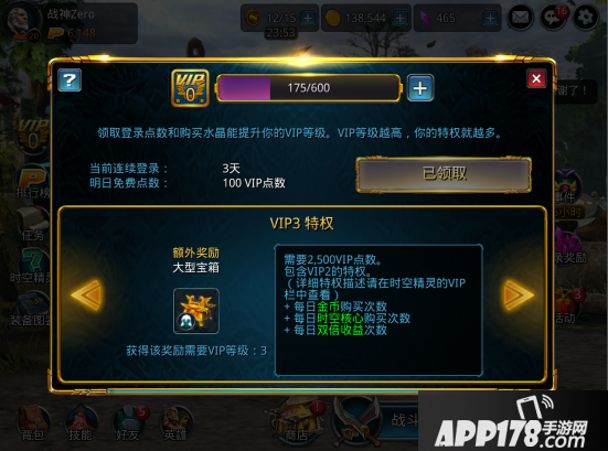 【时空核心购买次数】:V3~15分别都会提升购买次数上限。体力就是装备、金币。有足够体力刷个副本连曝二件神话装备不是梦(实测国服概率可以有),间接提升战斗力必备。实际购买收益高