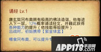 诵经 :唐玄奘冈布奥拥有极高的佛法造诣,他每进入下一层,12%概率诵读经文,并藉此获得各种能力的提升(依技能等级提升)。
