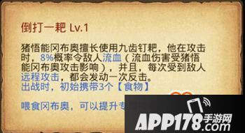 倒打一耙 :猪悟能冈布奥擅长使用九齿钉耙,他在攻击时,8%概率令敌人流血(流血伤害受猪悟能冈布奥攻击影响),并且,每次受到敌人远程攻击,都会发动一次反击。出战时,初始携带【食物】。