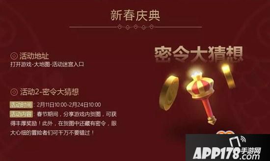不思议迷宫的密令大猜想是新春庆典活动之一,大家可以通过分享游戏内的贺图获得奖励,贺图中还可能隐藏着密令,今天APP178手游小编告诉大家具体的活动玩法吧。