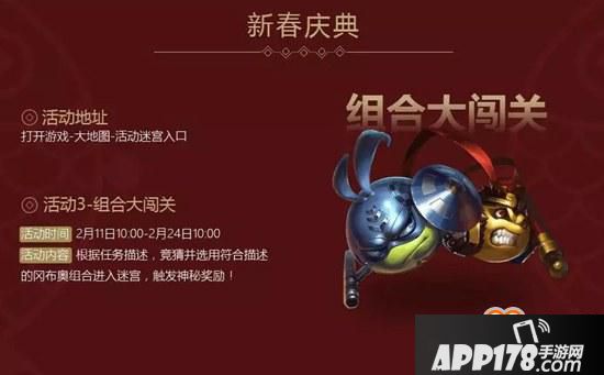 不思议迷宫组合大闯关是新春庆典中将要开启的活动之一,玩家可以通过任务描述使用对应的冈布奥组合闯关,即可触发神秘奖励,先来和APP178手游小编看看本次的活动详情吧!