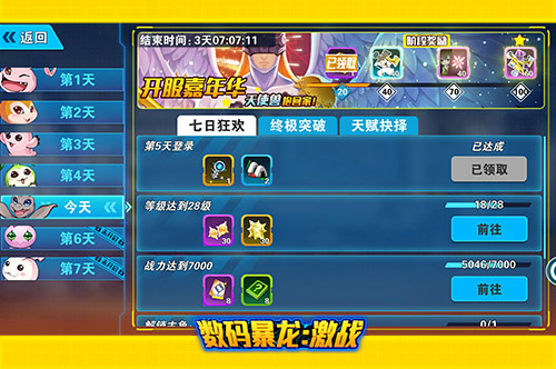 在开服的七天之内,如果玩家达成了相应目标,还会有海量福利相送,目标涉及的范围不仅包括了等级、战力、副本通关数,甚至只要数码兽的数量达到了要求,我们也送!相信这些要求对于各位玩家而言都是小菜一碟,而福利也多种多样,钻石、主角徽章、芯片、技能果实等各项福利都在等你。可以毫不夸张的说,让玩家分分钟点领取点到手软,累计完成任务数达标后,还有可爱的天使兽让你抱回家呦。