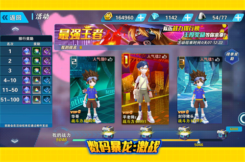 在游戏中,战斗力也是衡量玩家实力的重要因素,试问谁没有个王者梦呢?就让《数码暴龙:激战》来满足你吧!在战力榜中前100名都可以获得豪华大礼,名次越靠前,礼包越丰厚。战力榜第一的玩家上线时还会有全服通告呦,不知最强王者会是哪一位霸主呢!