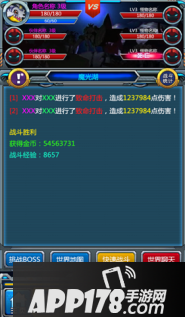 点击屏幕下方“战斗”==》显示战斗画面,开始自动打怪==》点击“世界地图”==》出现战斗地图选择画面==》点击“挑战boss”==》若取胜则进入新地图打怪(不胜留在本地图继续打怪)
