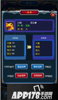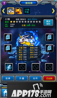 点击屏幕下方“数码兽”==》可查看数码兽的类型、属性、装备与技能==》点击“培养”==》可花费金币和钻石提升数码兽的基本属性==》点击“升星”==》消耗进阶之书可提升数码兽的附加属性==》点击“光环”==》可激活数码兽的光环效果