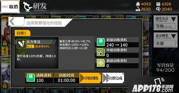 在训练枪娘技能时,需消耗特殊材料“训练资料”,训练时需一定时间等待训练结束,也可使用道具立即完成。