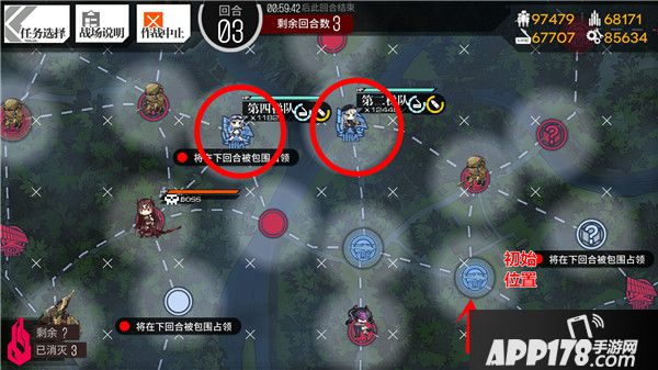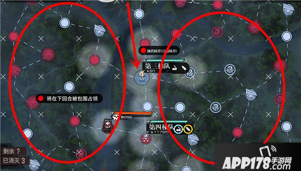 图4:从初始位置以两个梯队占领红圈内的雷达站,Boss有很大几率在左侧